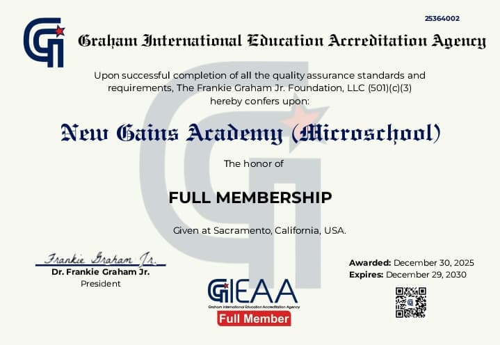 The Graham International Education Accreditation Agency (GIEAA) is excited to announce that New Gains Academy (Microschool) has been granted GIEAA Full Membership, recognizing its commitment to quality education, holistic student development, and innovative learning culture in practice.