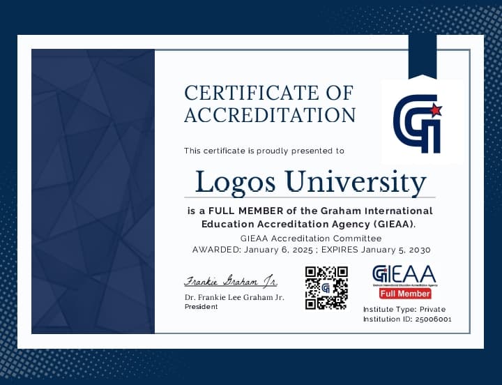 Logos University® has been granted Full Membership by the Graham International Education Accreditation Agency (GIEAA), marking a significant milestone in the institution’s commitment to academic excellence. The Full Membership status is the highest membership level at GIEAA and provides Logos University access to a global network dedicated to advancing educational quality. As a Full Member, Logos University will benefit from comprehensive accreditation services, ensuring that its programs meet internationally recognized standards of quality and effectiveness.